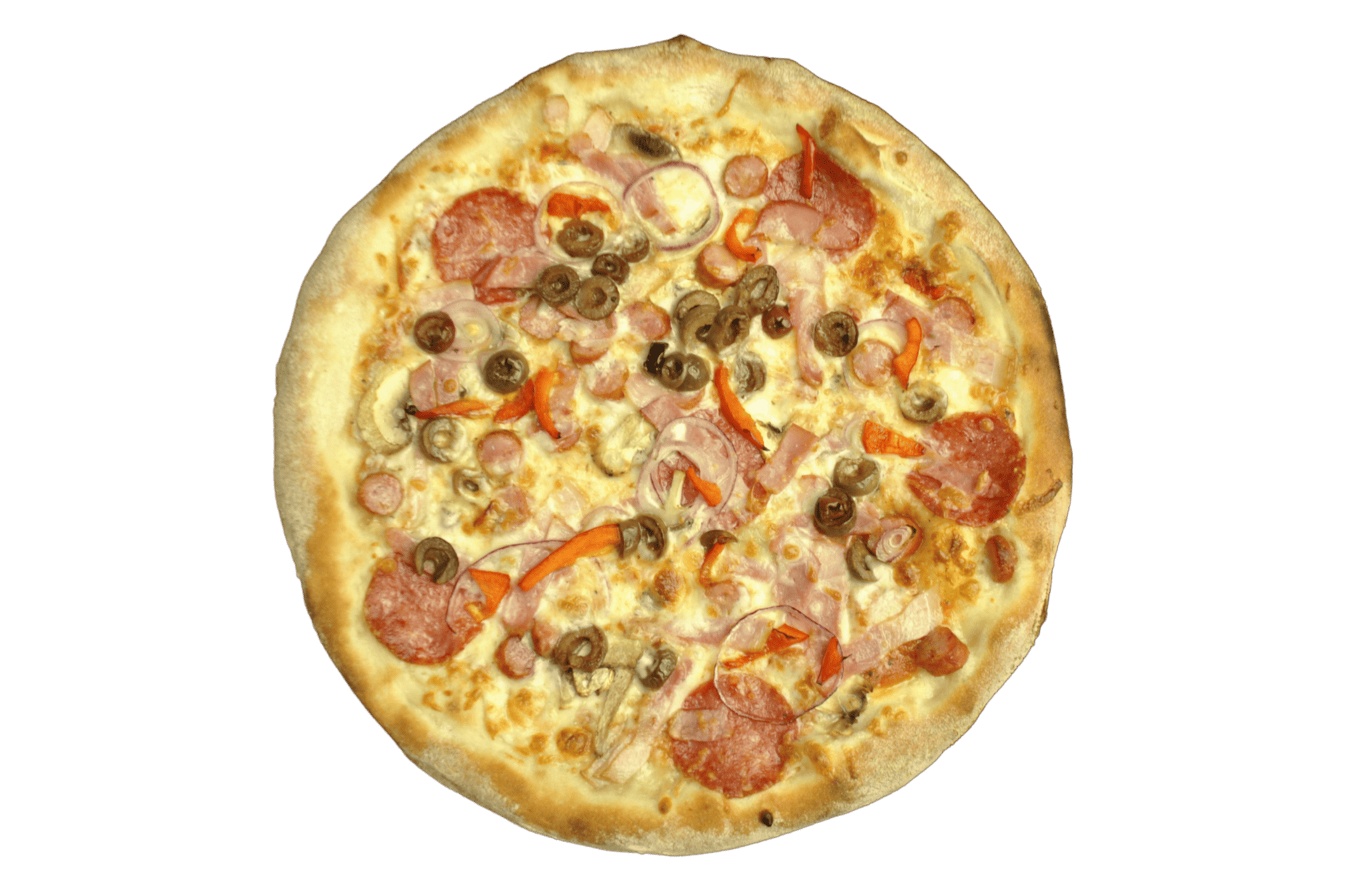 Blat, sos rosu, topping, salam, cabanosi, bacon, ceapa, masline, ciuperci, ardei